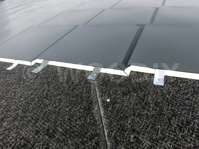 - Posez le lé suivant, bord autocollant sur bord autocollant, en respectant le sens d’écoulement de l’eau, de sorte que l’eau s’écoule de bas en haut du toit. Assurez-vous que le lé supérieur passe par-dessus le lé du dessous. Une fois en place, retirez les bandes pelables et appliquez une pression manuelle sur les recouvrements pour améliorer le collage.