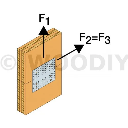 n = nombre de fixations (pointes CNA ou vis CSA) sur la partie haute ou basse de la plaque. Ce nombre de fixations doit être identique sur les deux éléments bois.