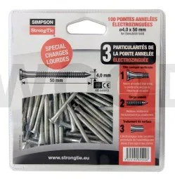 Les pointes annelées électrozinguées CNA sont préconisées pour les assemblages structurels des connecteurs Simpson Strong-Tie. Tous nos essais ont été réalisés avec ce type de pointes. Pour plus de traçabilité sur les chantiers, elles sont estampillées ≠, une garantie de qualité sans équivalent.