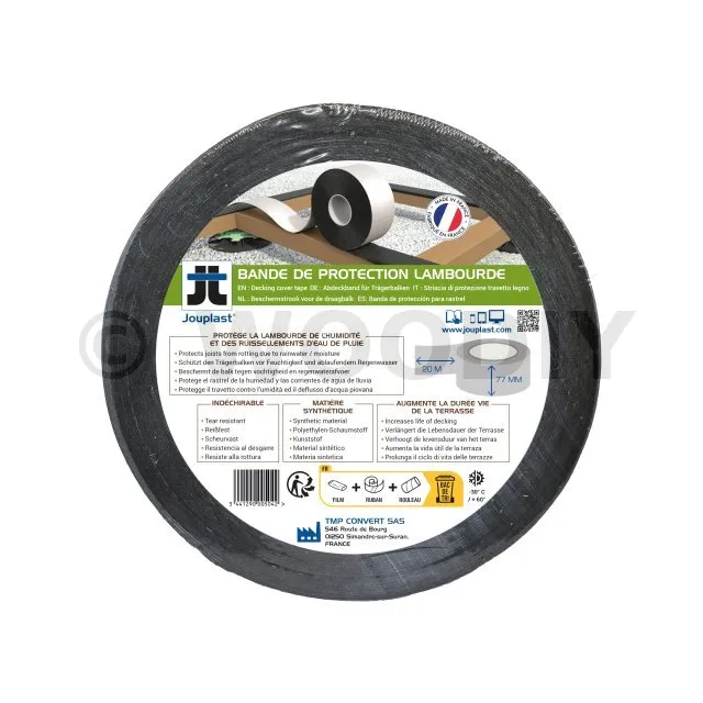 Cette bande a pour rôle d’étanchéifier les lambourdes constituant la structure de votre terrasse pour rendre votre ouvrage plus pérenne. En effet, les ruissellements des eaux de pluie ne vont plus s’attaquer aux lambourdes, ce qui évitera le pourrissement de ces derniers.