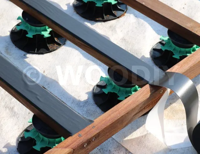 Une fois vos lambourdes fixés sur les supports (exemple : plots en béton), coller directement la bande sur la face qui recevra les lames de platelage. Ayant une largeur de 77 mm, la bande vous permettra largement de recouvrir la largeur des lambourdes plus quelques millimètres de chaque côté afin de bien étanchéifier les parties hautes et éviter que les eaux ne stagnent sur la surface.