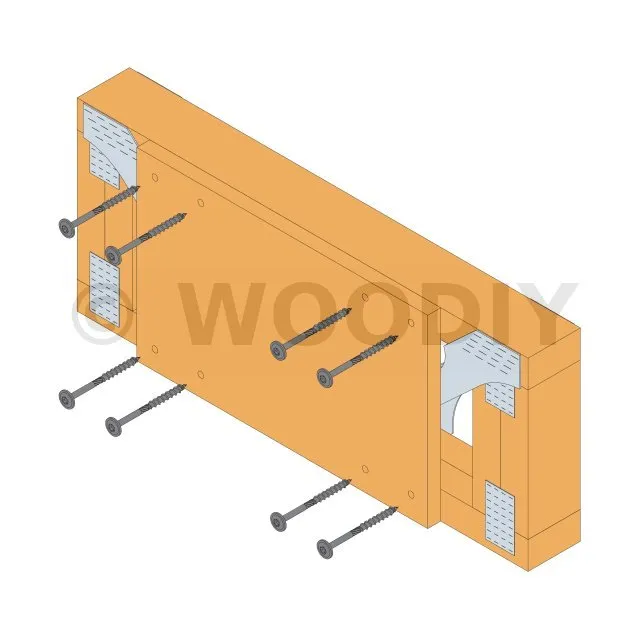 1. Cas d’une poutre porteuse métallique ajourée : installer une plaque en contreplaqué de 18 mm sur la face de la solive à âme métallique. Cette plaque doit avoir une longueur minimum de 400 mm et couvrir toute la hauteur de la solive à âme métallique. La plaque en contreplaqué est installé avec 8 vis ESCR8,0x80mm, positionnées conformément à l’illustration ci-dessous,