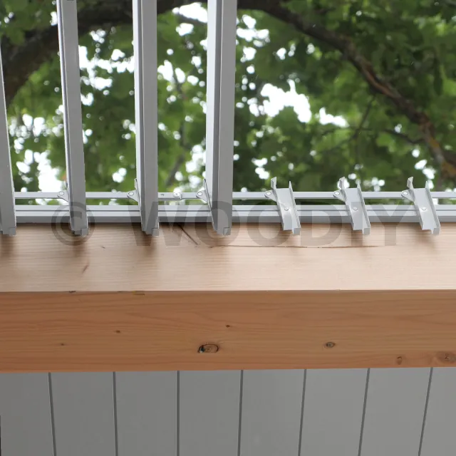 Fixation invisible : Les mécanismes sont assemblés entre eux par un embout spécial, lui même fixé sur le support (poutre de la pergola par exemple). La fixation doit être de diamètre 5mm, en INOX. Sa longueur et sa nature dépendent du support :