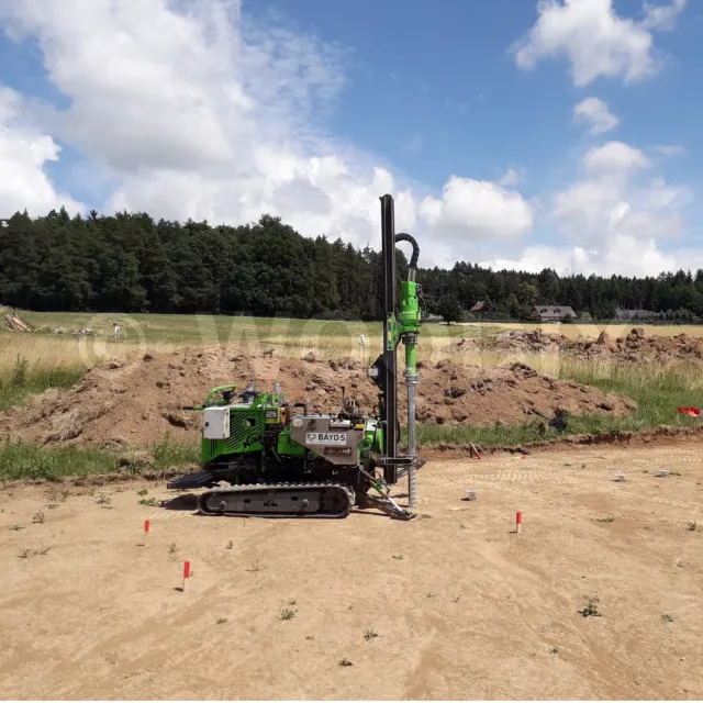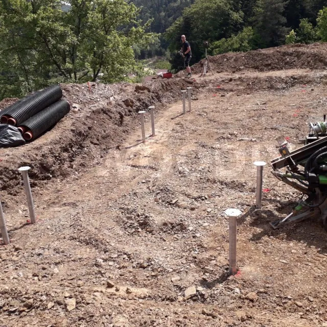 Pour les sols difficiles et complexes, nous utilisons des technologies additionnelles pour l’installation de pieux vissés, telles que le pré-perçage par compresseur HDT ou le carottage pour l’asphalte.
