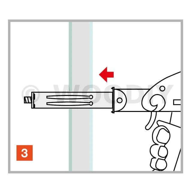 La cheville est disposée dans le perçage sur le support avec une pince dédiée, l’action de la pince permet l’expansion et le verouillage de la cheville contre le support.