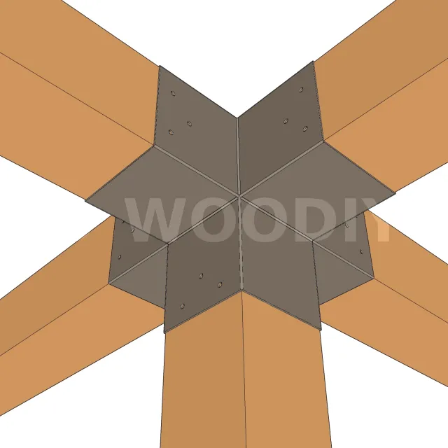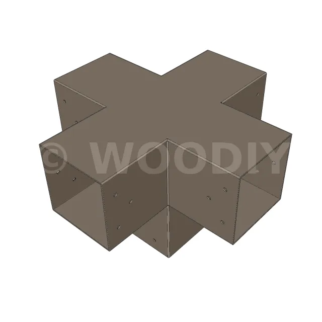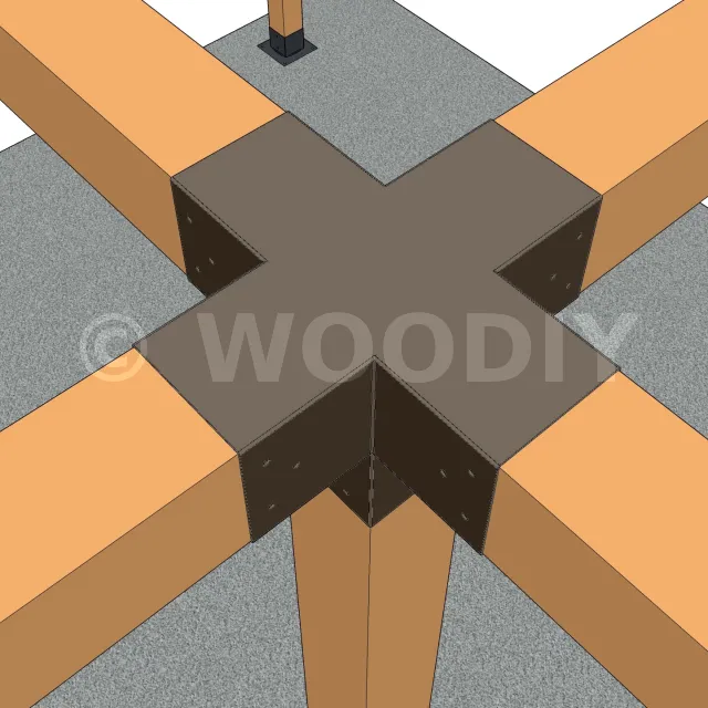 Il permet de raccorder deux poutres 120x120mm perpendiculairement à une autre poutre 120x120mm, le tout étant supporté par un poteau vertical de 120x120mm.