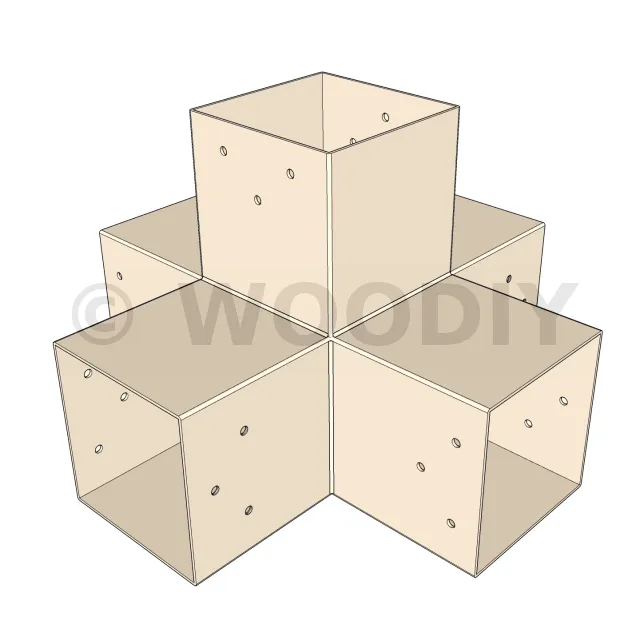 Il permet de raccorder deux poutres 120x120mm perpendiculairement à une autre poutre 120x120mm, le tout étant supporté par un poteau vertical de 120x120mm.