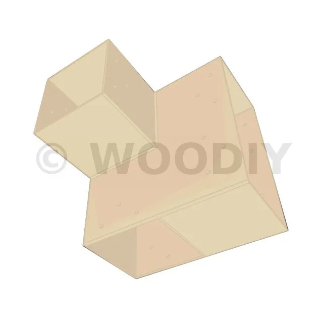 Il est utilisé dans un angle extérieur. Ce connecteur va permettre de raccorder une grosse poutre 240x120mm perpendiculairement à une poutre 120x120mm, le tout étant supporté par un poteau vertical 120x120 mm.