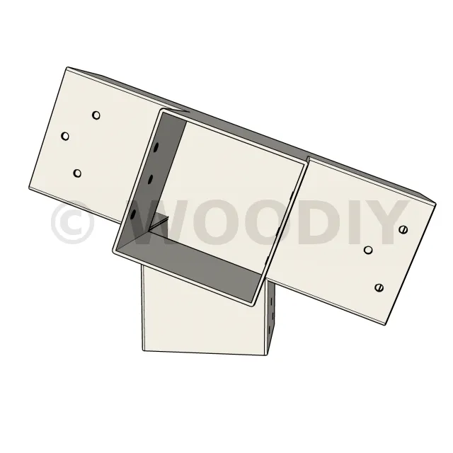 Connecteur d’angle intérieur à quatre directions, conçu pour l’assemblage de deux poutres en section 90x90 mm formant un angle de 20° avec un poteau vertical de même section. Il assure une liaison structurelle rigide et orthogonale à mi-hauteur, garantissant la stabilité de l’ensemble.