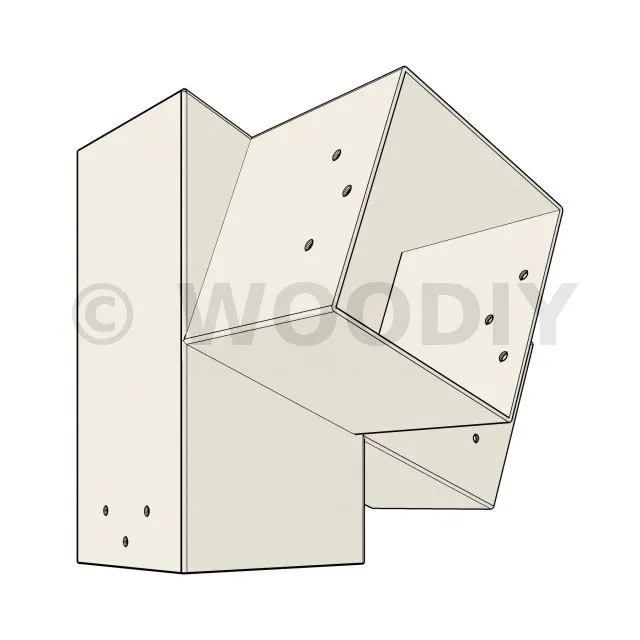 Il est utilisé dans un angle extérieur. Ce connecteur va permettre de raccorder une poutre 120x120mm à une poutre 120x120mm avec une pente de 20°, le tout étant supporté par un poteau vertical 120x120mm.