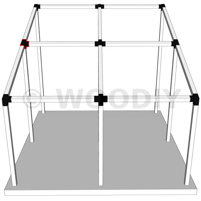 Connecteur d’angle intérieur à quatre directions, conçu pour l’assemblage de deux poutres en section 120x120 mm formant un angle de 20° avec un poteau vertical de même section. Il assure une liaison structurelle rigide et orthogonale à mi-hauteur, garantissant la stabilité de l’ensemble.