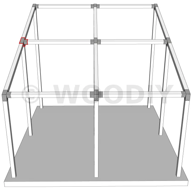 Connecteur d’angle intérieur à quatre directions, conçu pour l’assemblage de deux poutres en section 120x120 mm formant un angle de 20° avec un poteau vertical de même section. Il assure une liaison structurelle rigide et orthogonale à mi-hauteur, garantissant la stabilité de l’ensemble.