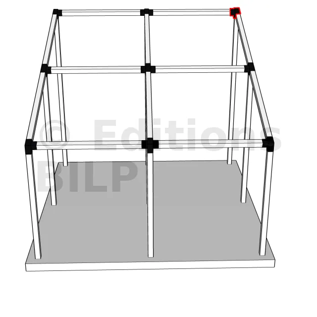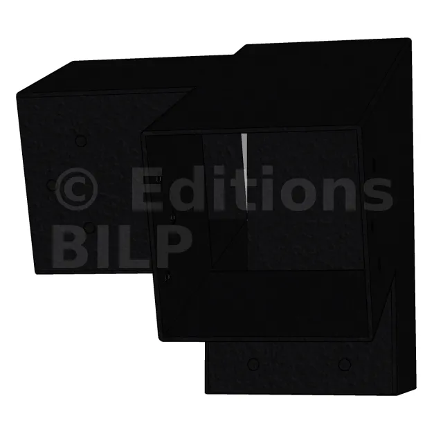 Il est utilisé dans un angle extérieur. Ce connecteur va permettre de raccorder une poutre 90x90mm à une poutre 90x90mm avec une pente de 20°, le tout étant supporté par un poteau vertical 90x90mm.