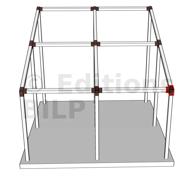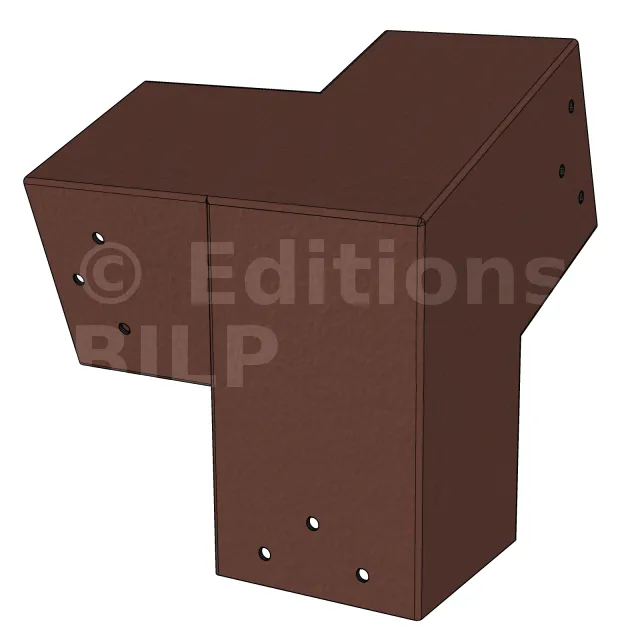Il est utilisé dans un angle extérieur. Ce connecteur va permettre de raccorder une poutre 90x90mm à une poutre 90x90mm avec une pente de 20°, le tout étant supporté par un poteau vertical 90x90mm.