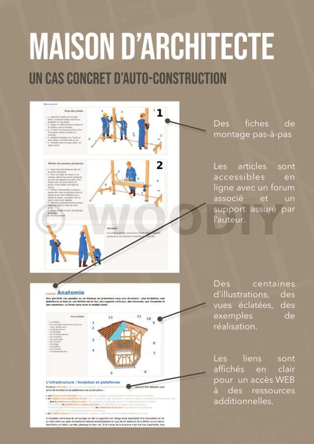 Un exemple de projet détaillé étapes par étapes. Tous les secrets, tous les trucs et les astuces pour réussir l’auto-construction de votre maison ossature bois. Toutes les techniques, tous les produits vous sont décrits de façon objective et indépendante. Des vues détaillées vous décrivent toutes les étapes de la construction.