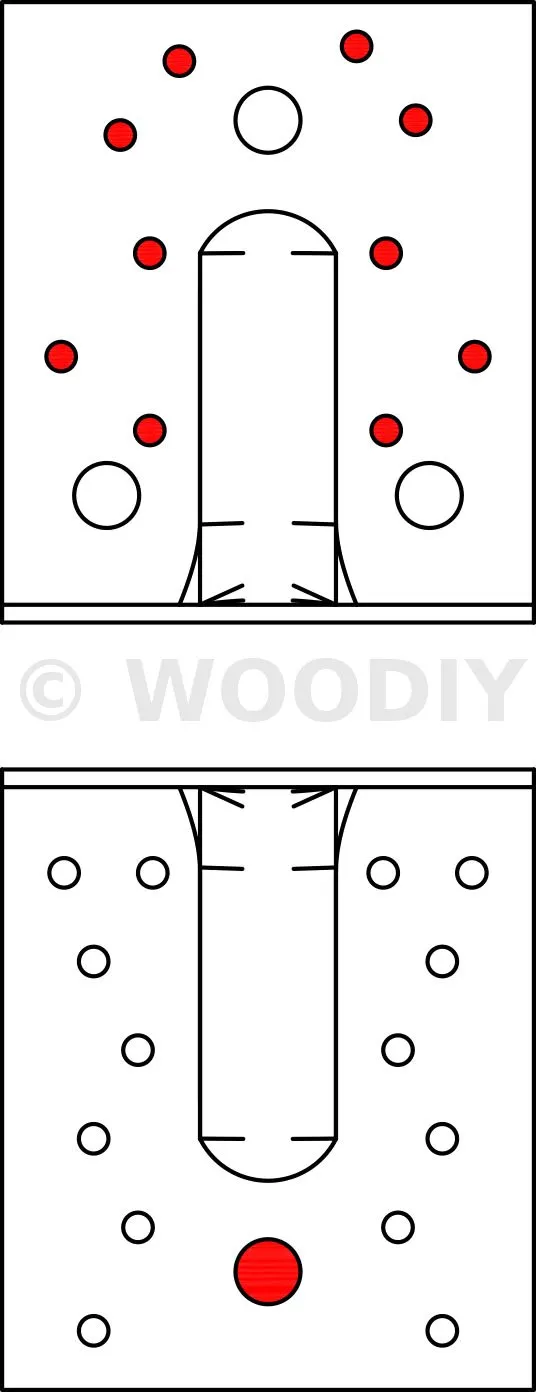 - Fixation BOIS/BOIS - clouage totalAile A : 4 ; Aile B : 6 ; type : Pointes annelées CNA Ø4.0x35 ou Ø4.0x40 ou Ø4.0x50 ou Ø4.0x60 mm, Vis CSA Ø5.0x35 ou CSA Ø5.0x40