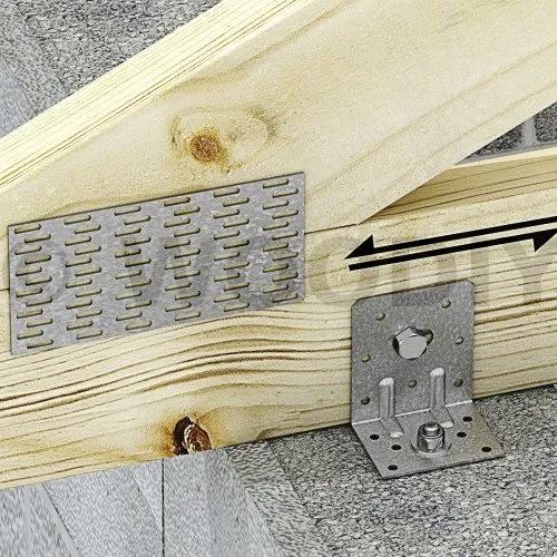 Dans le cas d’un déplacement calculé de la ferme de plus de 6 mm, il faut alors réaliser un appui glissant. Le glissement est autorisé par le trou oblong situé sur nos équerres (source DTU 31.3, P3/5.3.3)