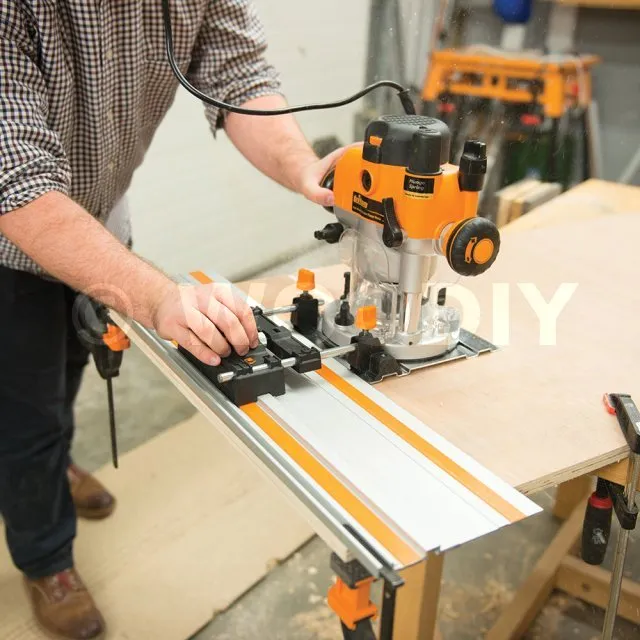 - Permet d’attacher des rails de guidage à la défonceuse en toute simplicité pour une meilleure stabilité et précision pour effectuer des lignes droites.