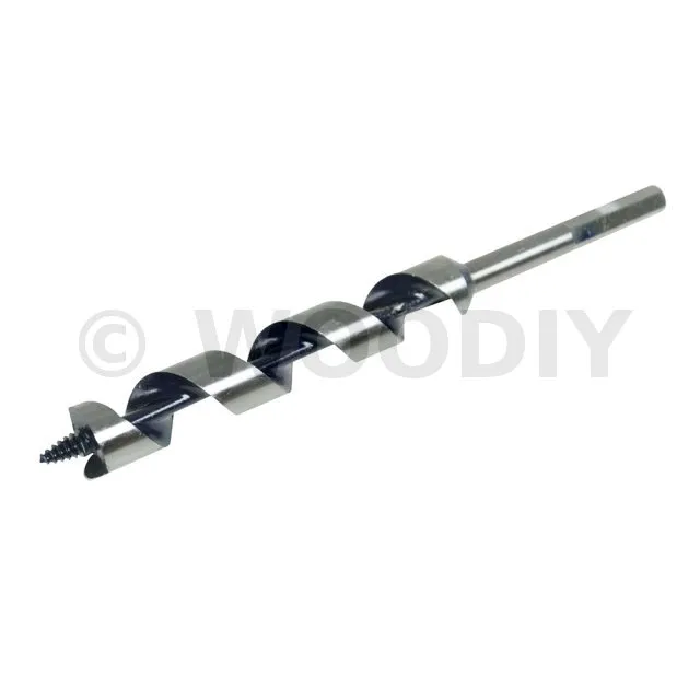 Mèche hélicoïdale en acier carbone trempé et rectifié avec précision, queue 6 pans. Pointe de centrage filetée exerçant une traction dans le bois, et ébaucheur unique amorçant la pénétration dans le bois pour le tranchant, pour des perçages plus précis.