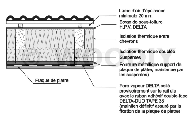 Ruban adhésif double-face armé bi-composants avec film pelable en sous-face permettant le maintien provisoire par collage du pare-vapeur sur le profilé métallique support de la plaque de plâtre.