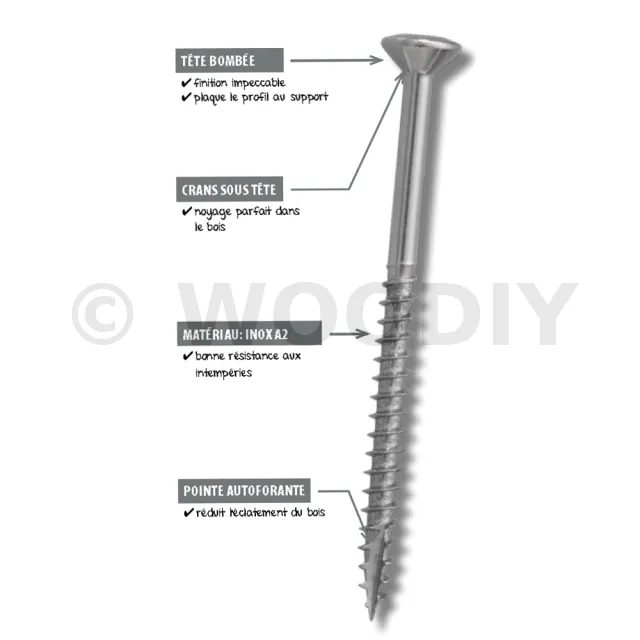 L’INOX A2 convient dans la plupart des situations. Mais si votre terrasse en bois est bâtie autour d’une piscine, ou à moins de 50km des cotes, alors c’est de l’INOX A4 qu’il vous faut.