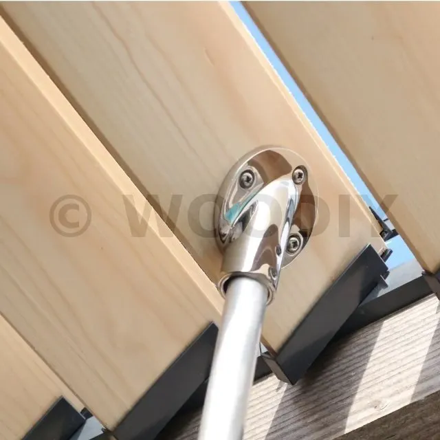 Embase inox femelle pour actionnement des lames positionnées en hauteur. L’embase se monte sur une lame et permet de recevoir la baguette d’actionnement amovible.