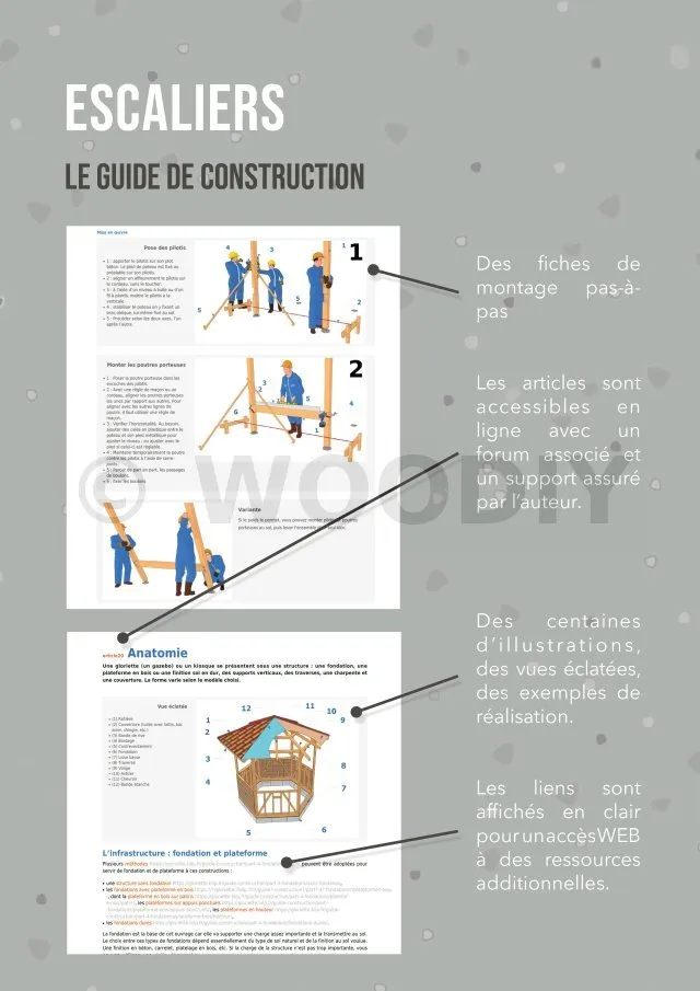 Des informations concrètes pour votre projet. Tous les secrets, tous les trucs et astuces pour réussir la construction de votre escalier. Toutes les techniques ainsi que tous les modèles vous sont décrits de façon objective et indépendante. Des vues détaillées pour vous décrire toutes les étapes de la construction.