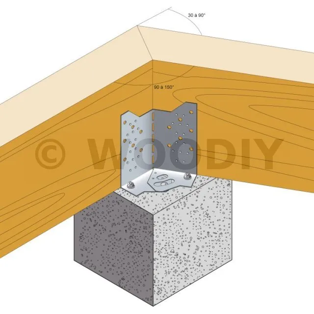 L’équerre réglable pour dalle bois ABF230 permet la fixation de ceinture porteuse de dalle bois sur plot béton. Elle est réglable en angle sur chantier et permet ainsi d’obtenir un angle intérieur entre les poutres bois de 90 à 150°. Des repères visuels sur la pièce permettent un ajustement à l‘angle souhaité.