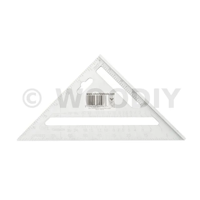 Équerre à corps robuste en alliage d’aluminium moulé, graduations impériales en relief faciles à lire, et table de conversion pour la pose de chevrons. À bords relevés pour une localisation sure. Échelle de rapporteur 0-90°. À utiliser comme guide lors du sciage pour les mesures d’angle et les coupes. Poids 125 g. Dimensions : 185 x 185 x 260 mm.