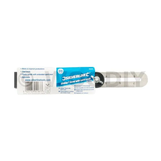Angle réglable, lame en acier à graduations métriques et impériales, poignée en plastique avec niveau à bulle incorporé et vis de fixation.