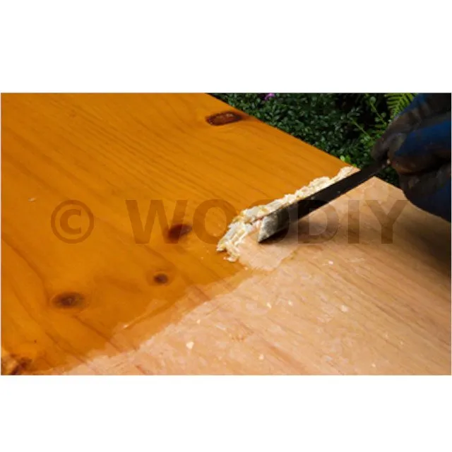 - Enlever la pâte obtenue avec une spatule ou une brosse à chiendent en nylon (selon dureté du bois). Sur bois fragile ou sur support intérieur pour un aspect soigné, préférer une brosse en laiton doux. Rincer le DSP 800 à l’aide d’une éponge humide imbibée d’eau tiède (attention à ne pas relever la fibre du bois, si besoin égrener avec du papier abrasif de grain moyen à fin).