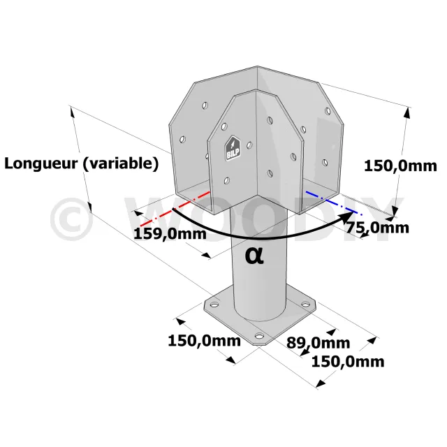 Poteau structurel OSP - D89mm - Platine haute en L 75x159x150mm - Embase 150x150mm