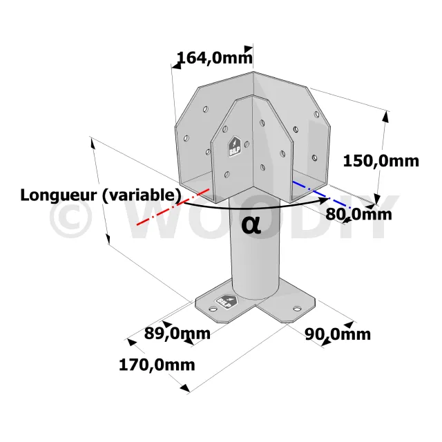 Poteau structurel OSP - D89mm - Platine haute en L 80x164x150mm - Embase en angle 90x170mm