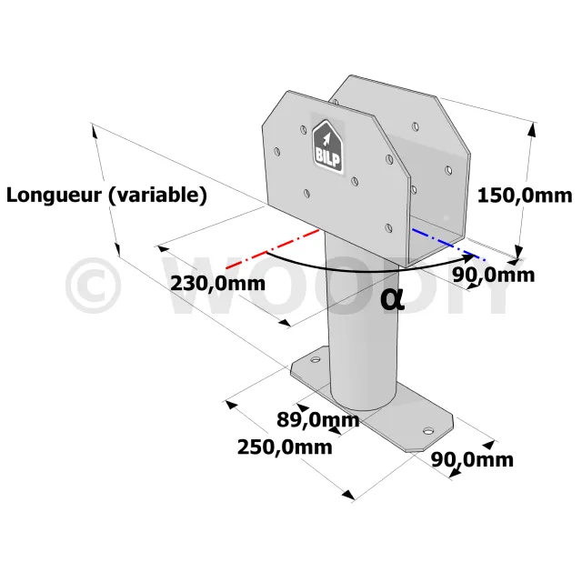 Poteau structurel OSP - D89mm - Platine haute en U 90x230x150mm - Embase rectangulaire 90x250mm