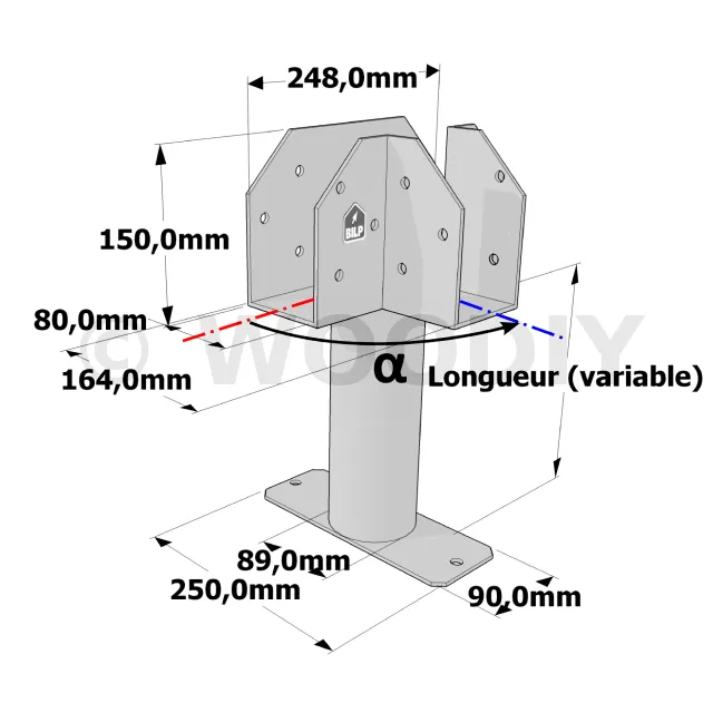 Poteau structurel OSP - D89mm - Platine haute en T 80x164x150mm - Embase rectangulaire 90x250mm