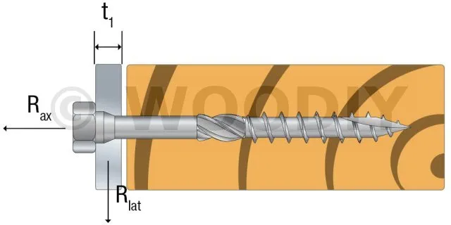 - Vis SSH installée avec un fraisage, perpendiculairement à la fibre du bois, et sollicitée avec un angle.