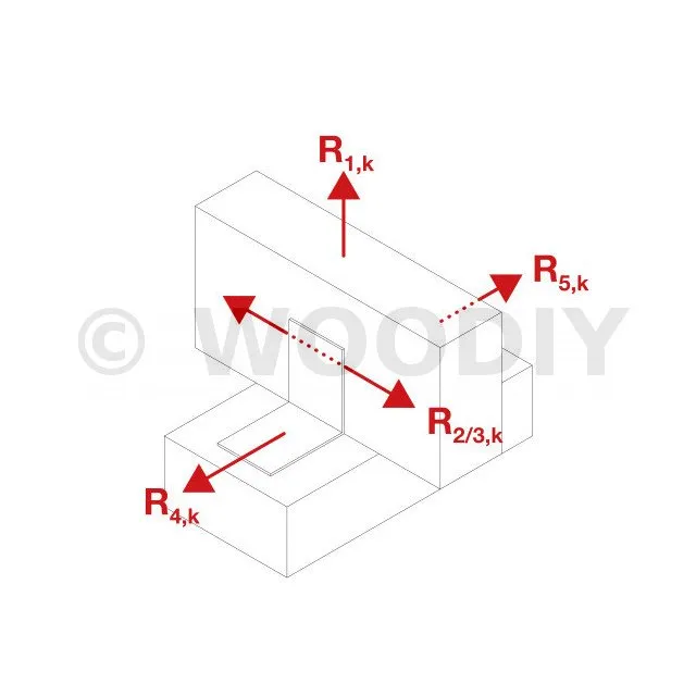 2. Si la conception de la structure empêche la rotation de l’élément bois alors les valeurs R1,k et R2,k , dans un assemblage avec une seule équerre, peuvent être prises égale à la moitié des valeurs données dans les tableaux.