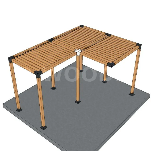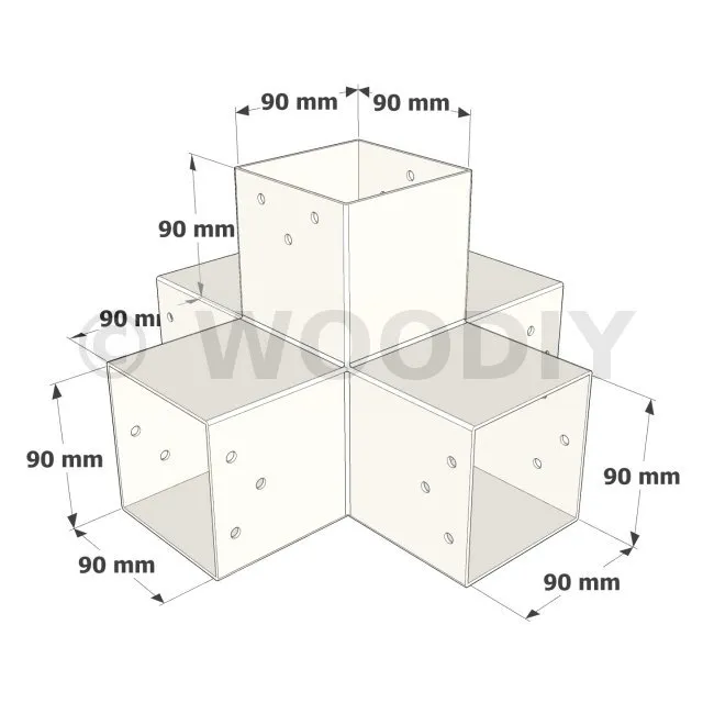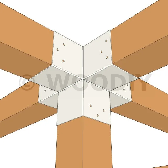 Il permet de raccorder deux poutres 90x90mm perpendiculairement à une autre poutre 90x90mm, le tout étant supporté par un poteau vertical de 90x90mm.