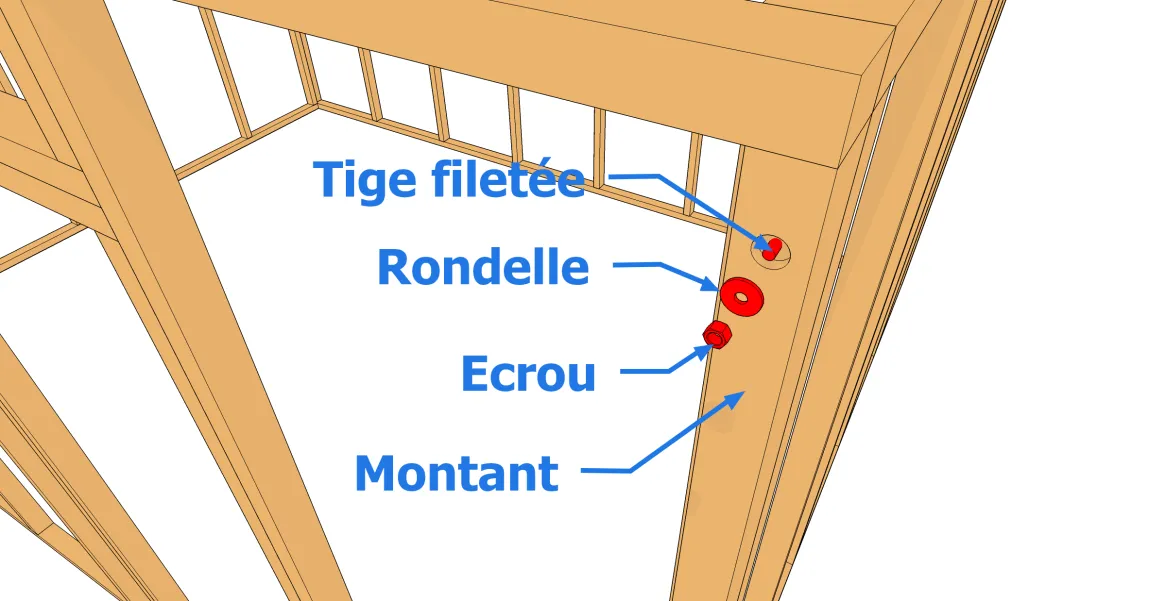 | Tige filetée D10 x L120 accompagnée de 2 écrous et 2 rondelles | Assure la liaison des murs aux angles | Une tige filetée + 2 écrous hexagonaux + 2 rondelles plates tous les 60 cm environ. | Commander | |