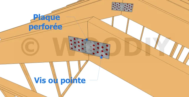 | Plaque perforée Largeur (A) 140 mm x Hauteur (B) 200 mm | Solidarise les têtes des chevrons | Une plaque de chaque côté des têtes de chevrons | Commander | |