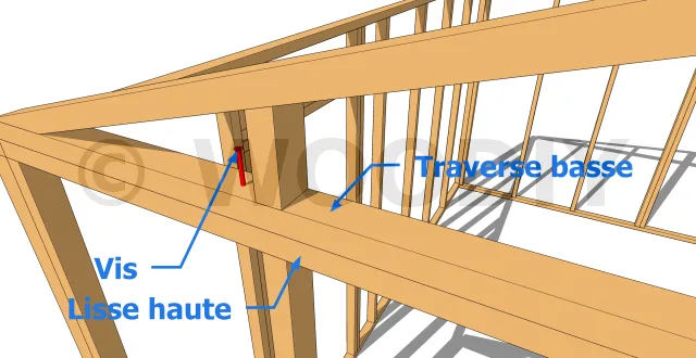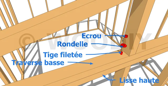 | Tige filetée D10 x L120 accompagnée de 2 écrous et 2 rondelles plates | Assure la fixation des traverses basses des pignons aux lisses hautes des ossatures de mur | Une fixation tous les 50 cm environ. | Commander | |